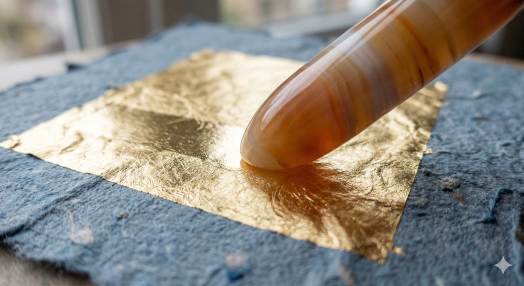 [IMAGE STRATEGY: A tight, macro-lens photograph showing a polished agate burnishing tool resting on a partially burnished sheet of 24k gold leaf applied to blue-ish handmade paper. Alt-text: A close-up of an agate burnisher pressing into 24-karat gold leaf on textured handmade paper, revealing the contrast between matte and mirror-like finishes.]